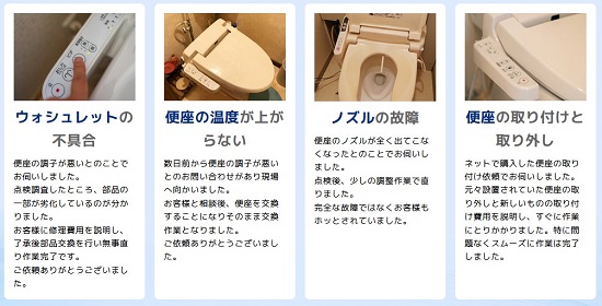 古河市で対応可能な温水便座、ウォシュレットの修理サービスとなります。その他のトラブルやご相談に関しましてはお気軽に受付窓口までお問い合わせください。